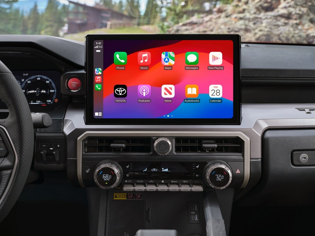 Inside the 2025 Tacoma cabin, you'll find supportive seating and thoughtful storage solutions for all your gear. Available leather trim and dual-zone automatic climate control create a refined ambiance. Stay connected on the go with a standard eight-inch or available 14-inch multimedia touchscreen featuring wireless Apple CarPlay® and Android Auto™ integration. The 10-speaker JBL premium audio system, offered on select trims, delivers an immersive listening experience.
