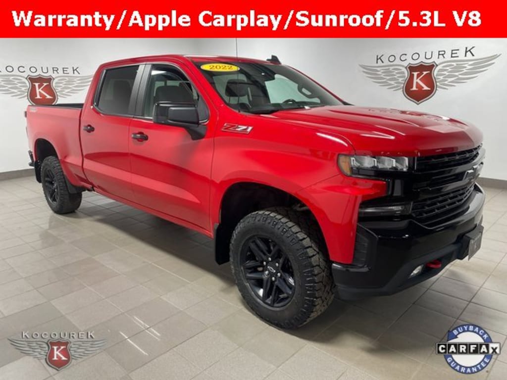 Recent Arrival! 4WD / 4X4 / AWD / Four Wheel Drive, 10-Way Power Driver Seat w/Lumbar, 12-Volt Rear Auxiliary Power Outlet, 120-Volt Bed Mounted Power Outlet, 120-Volt Instrument Panel Power Outlet, 2 USB Ports, 2 USB Ports (First Row), 4-Wheel Disc Brakes, 4.2 Diagonal Color Display Driver Info Center, 6-Speaker Audio System, ABS brakes, Air Conditioning, Alloy wheels, Apple CarPlay/Android Auto, Auto-Locking Rear Differential, Automatic temperature control, Auxiliary External Transmission Oil Cooler, Bed Protection Package, Bluetooth® For Phone, Brake assist, Chevrolet Connected Access Capable, Chevytec Spray-On Black Bedliner, Cloth Rear Seat w/Storage Package, Color-Keyed Carpeting Floor Covering, Compass, Convenience Package II, Convenience Package w/Buckets Seats, Delay-off headlights, Driver vanity mirror, Dual Exhaust w/Polished Outlets, Dual front impact airbags, Dual front side impact airbags, Dual-Zone Automatic Climate Control, Electric Rear-Window Defogger, Electronic Cruise Control, Electronic Stability Control, EZ Lift Power Lock & Release Tailgate, Floor Mounted Center Console, Front anti-roll bar, Front Bucket Seats, Front Center Armrest, Front dual zone A/C, Front fog lights, Front LED Fog Lamps, Front wheel independent suspension, Fully automatic headlights, HD Rear Vision Camera, Heated door mirrors, Heated Driver & Front Outboard Passenger Seats, Heated Steering Wheel, Heavy-Duty Air Filter, High Gloss Black Grille, High Gloss Black Mirror Caps, Hill Descent Control, Hitch Guidance, Illuminated entry, Integrated Trailer Brake Controller, Keyless Open & Start, Leather Wrapped Steering Wheel, LED Cargo Area Lighting, LED Reflector Headlamps, Low tire pressure warning, Manual Tilt/Telescoping Steering Column, Molded Black Splash Guards (LPO), Occupant sensing airbag, Off-Road Suspension w/2 Lift, OnStar & Chevrolet Connected Services Capable, Outside temperature display, Overhead airbag, Overhead console, Panic alarm, Performance Red Recovery Hooks, Power Door Locks, Power door mirrors, Power driver seat, Power Front Windows w/Driver Express Up/Down, Power Front Windows w/Passenger Express Down, Power Rear Windows w/Express Down, Power Sliding Rear Window w/Rear Defogger, Power Sunroof, Power windows, Preferred Equipment Group 2LT, Premium audio system: Chevrolet Infotainment 3, Premium Bose 7-Speaker Sound System, Radio data system, Radio: Chevrolet Infotainment 3 Plus System, Radio: Chevrolet Infotainment 3 System, Rear Dual USB Charging-Only Ports, Rear step bumper, Rear Vision Camera, Rear Wheelhouse Liners, Rear window defroster, Remote keyless entry, Remote Vehicle Starter System, Security system, SiriusXM Radio, SiriusXM w/360L, Speed-sensing steering, Standard Tailgate, Steering Wheel Audio Controls, Suspension Package, Tachometer, Telescoping steering wheel, Theft Deterrent System (Unauthorized Entry), Traction control, Trailering Package, Universal Home Remote, Variably intermittent wipers, Wheels: 18 x 8.5 Black Painted Aluminum, Wi-Fi Hot Spot Capable, Wireless Phone Projection.2022 Chevrolet Silverado 1500 LTD LT Trail Boss Odometer is 17438 miles below market average!Proudly serving guests in marathon, portage, langlade, oneida, taylor, vilias, wood, clark, lincoln, and waupaca counties. Please call one of our knowledgeable Sales Consultants with any questions you might have, or to verify listed options. Serving guests from Stevens Point, Plover, Wausau, Marathon, Portage, Langlade, Oneida, Taylor, Vilias, Wood, Clark, Lincoln, Waupaca or near me!