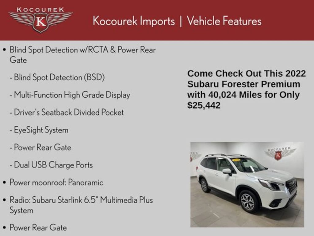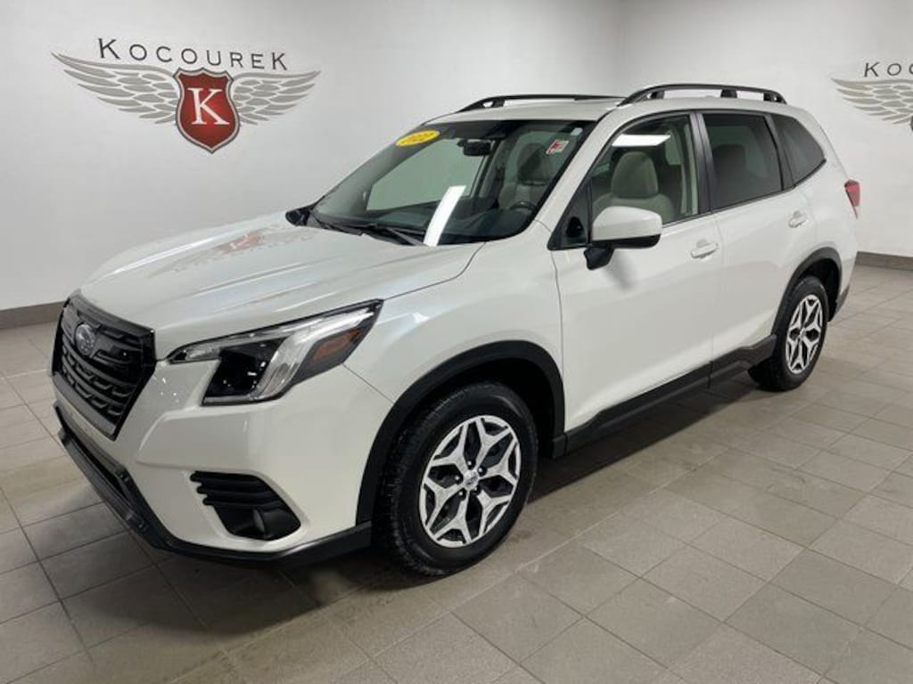 Forester Premium, 4D Sport Utility, 2.5L 4-Cylinder DOHC 16V, Lineartronic CVT, AWD, Crystal White Pearl, Gray Cloth, All-Weather Floor Liners, Auto High-beam Headlights, Blind Spot Detection (BSD), Blind Spot Detection w/RCTA & Power Rear Gate, Driver's Seatback Divided Pocket, Dual USB Charge Ports, EyeSight System, Front Bucket Seats, Fully automatic headlights, Heated Front Bucket Seats, Heated front seats, Multi-Function High Grade Display, Power driver seat, Power moonroof: Panoramic, Power Rear Gate, Radio: Subaru Starlink 6.5" Multimedia Plus System, Spoiler, STARLINK/Apple CarPlay/Android Auto, 3.70 Axle Ratio, 4-Wheel Disc Brakes, 6 Speakers, ABS brakes, Air Conditioning, Alloy wheels, AM/FM radio: SiriusXM, Anti-whiplash front head restraints, Automatic temperature control, Brake assist, Bumpers: body-color, CD player, Driver door bin, Driver vanity mirror, Dual front impact airbags, Dual front side impact airbags, Electronic Stability Control, Emergency communication system: STARLINK Safety and Security (Subscription Required), Exterior Parking Camera Rear, Four wheel independent suspension, Front anti-roll bar, Front Center Armrest, Front fog lights, Front reading lights, Heated door mirrors, Illuminated entry, Knee airbag, Low tire pressure warning, Occupant sensing airbag, Outside temperature display, Overhead airbag, Overhead console, Panic alarm, Passenger door bin, Passenger vanity mirror, Power door mirrors, Power steering, Power windows, Premium Cloth Upholstery, Radio data system, Rear anti-roll bar, Rear seat center armrest, Rear Seatback Protector, Rear window defroster, Rear window wiper, Remote keyless entry, Roof rack: rails only, Security system, Speed control, Speed-sensing steering, Split folding rear seat, Steering wheel mounted audio controls, Tachometer, Telescoping steering wheel, Tilt steering wheel, Traction control, Trip computer, Variably intermittent wipers, Wheels: 17" x 7.0J Black Machine Finish Alloy, Forester Premium, 4D Sport Utility, 2.5L 4-Cylinder DOHC 16V, Lineartronic CVT, AWD, Crystal White Pearl, Gray Cloth, All-Weather Floor Liners, Auto High-beam Headlights, Blind Spot Detection (BSD), Blind Spot Detection w/RCTA & Power Rear Gate, Driver's Seatback Divided Pocket, Dual USB Charge Ports, EyeSight System, Front Bucket Seats, Fully automatic headlights, Heated Front Bucket Seats, Heated front seats, Multi-Function High Grade Display, Power driver seat, Power moonroof: Panoramic, Power Rear Gate, Radio: Subaru Starlink 6.5" Multimedia Plus System, Spoiler, STARLINK/Apple CarPlay/Android Auto.